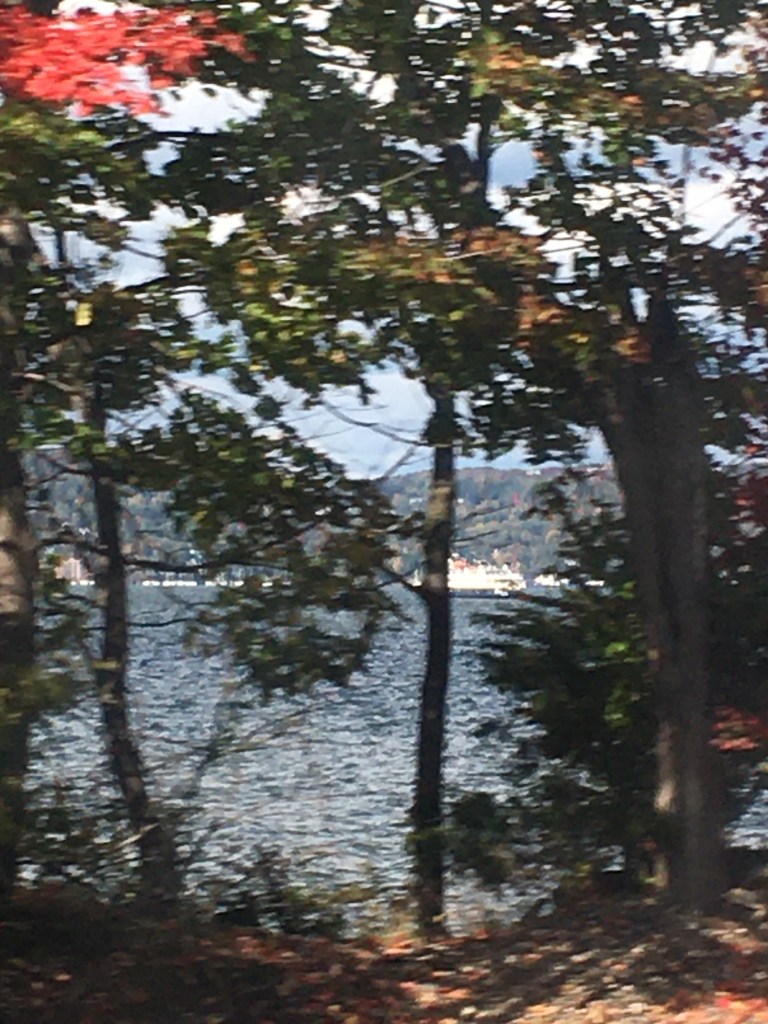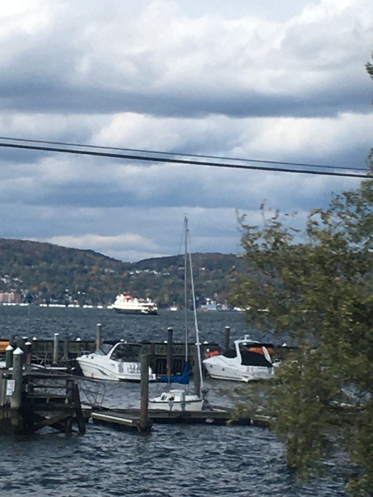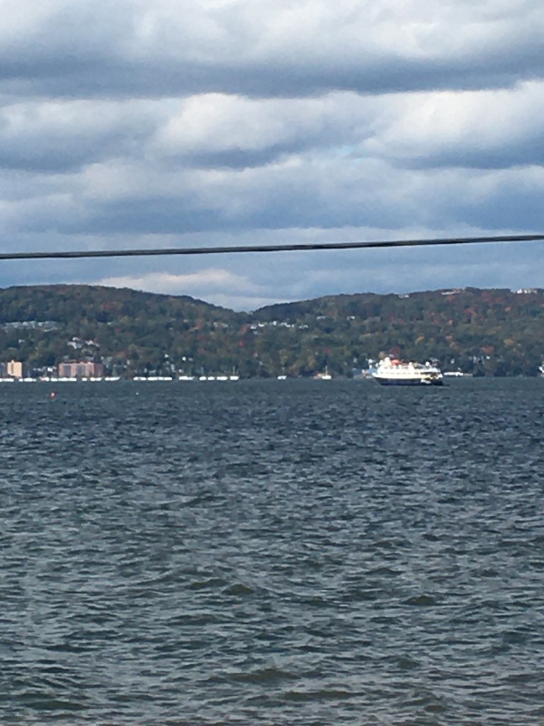 “This morning on our walk, we were surprised to see a 155’ long ship hove to off Mine Dock Park in Fort Montgomery.